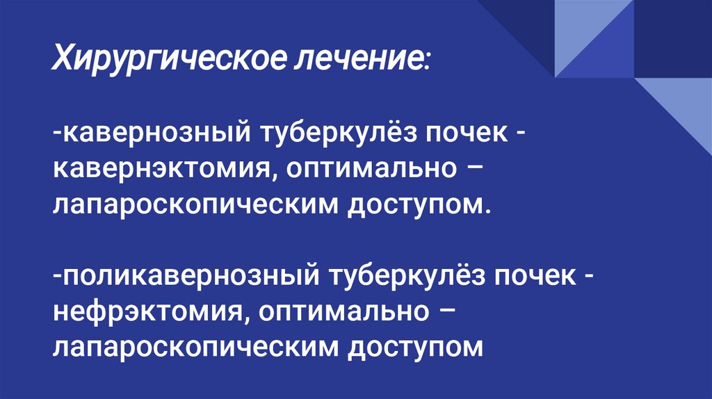 Хирургическое лечение:-кавернозный туберкулёз почек кавернэктомия, оптимально –