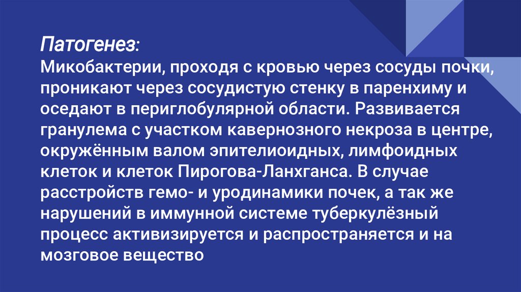 Патогенез:Микобактерии, проходя с кровью через сосуды почки,
