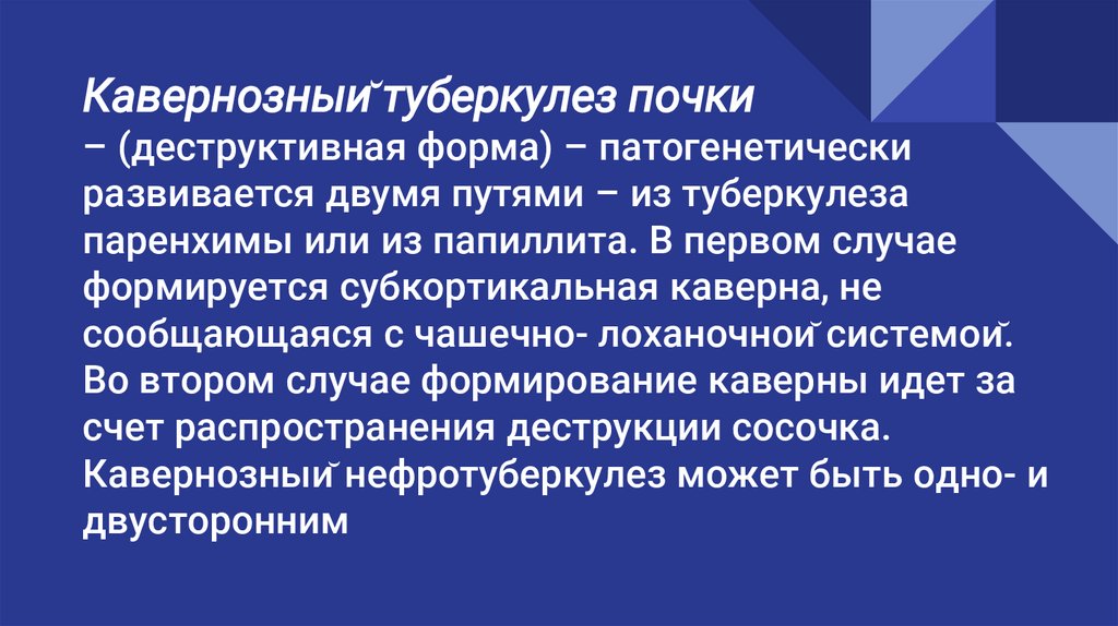 Кавернозный туберкулез почки– (деструктивная форма) – патогенетически
