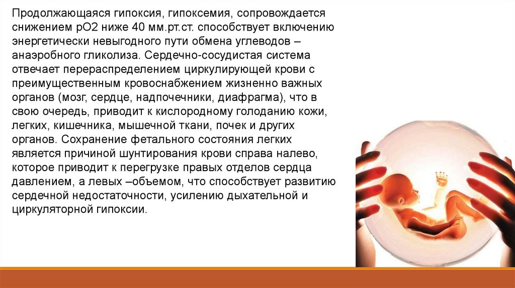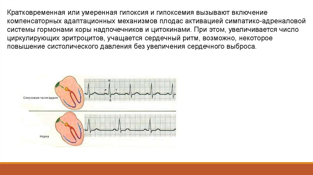 Кратковременная или умеренная гипоксия и гипоксемия вызывают включениекомпенсаторных адаптационных механизмов плодас активацией симпатико-адреналовой