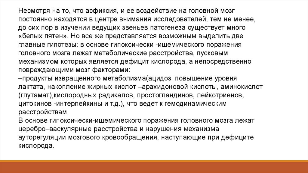 Несмотря на то, что асфиксия, и ее воздействие на головной мозгпостоянно находятся в центре внимания исследователей, тем не менее,