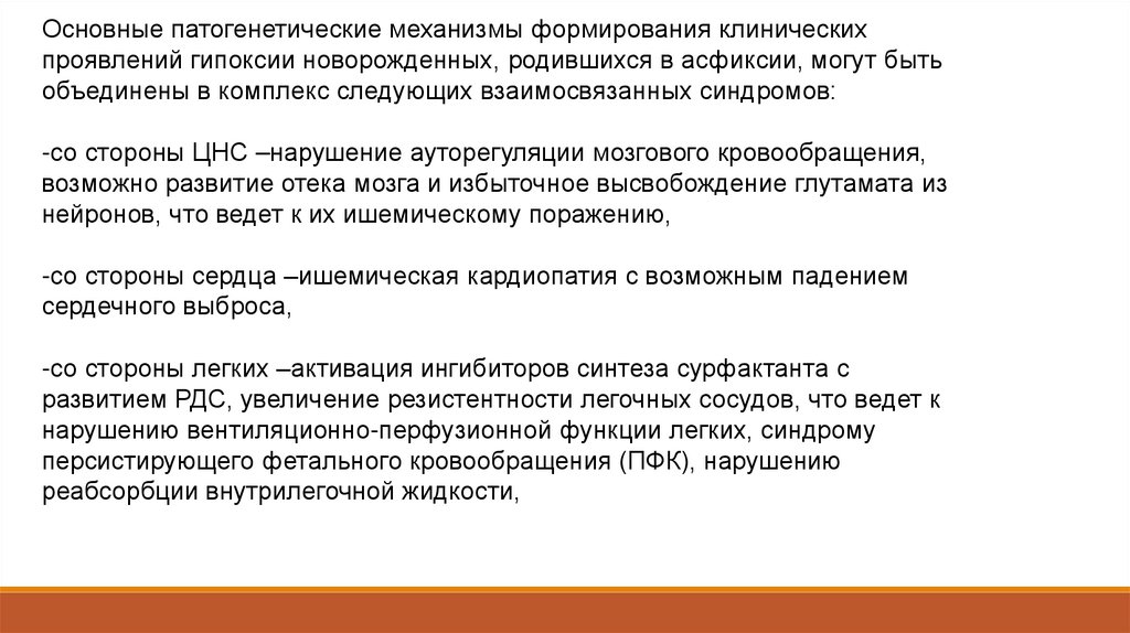 Основные патогенетические механизмы формирования клиническихпроявлений гипоксии новорожденных, родившихся в асфиксии, могут быть