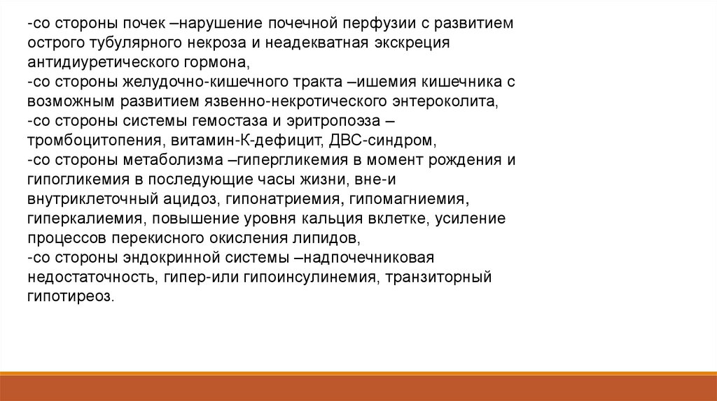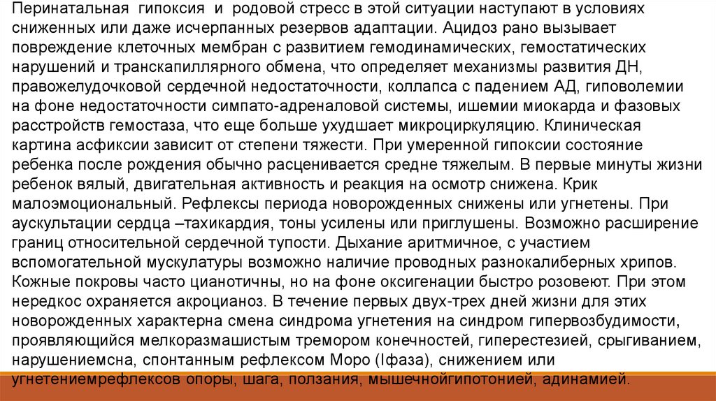 Перинатальная гипоксия и родовой стресс в этой ситуации наступают в условияхсниженных или даже исчерпанных резервов адаптации. Ацидоз рано вызывает