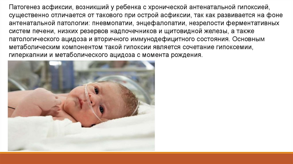Патогенез асфиксии, возникший у ребенка с хронической антенатальной гипоксией,существенно отличается от такового при острой асфиксии, так как развивается на фоне