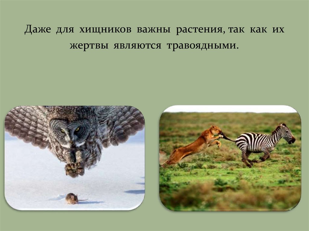 Даже для хищников важны растения, так как ихжертвы являются травоядными.