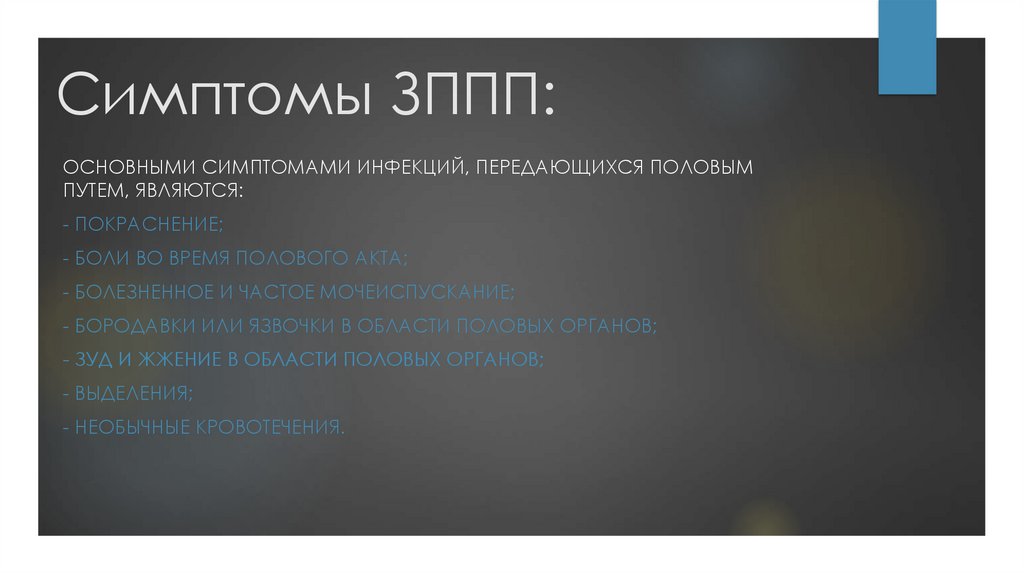 Симптомы ЗППП:ОСНОВНЫМИ СИМПТОМАМИ ИНФЕКЦИЙ, ПЕРЕДАЮЩИХСЯ ПОЛОВЫМ