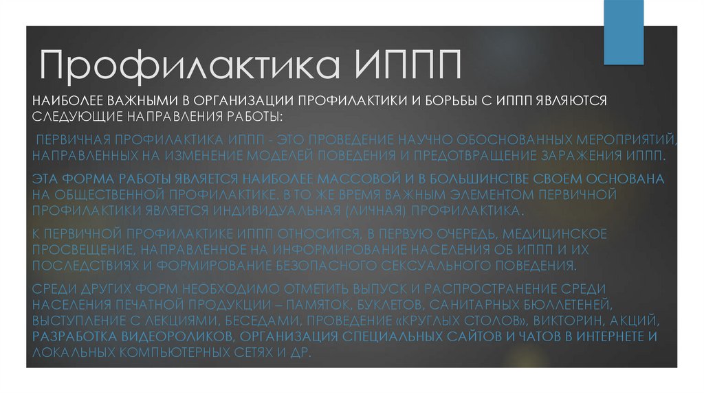 Профилактика ИПППНАИБОЛЕЕ ВАЖНЫМИ В ОРГАНИЗАЦИИ ПРОФИЛАКТИКИ И БОРЬБЫ С ИППП ЯВЛЯЮТСЯ