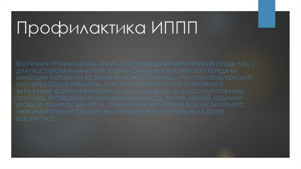 Профилактика ИПППВТОРИЧНАЯ ПРОФИЛАКТИКА ИППП – ЭТО ПРОВЕДЕНИЕ МЕРОПРИЯТИЙ СРЕДИ ЛИЦ С