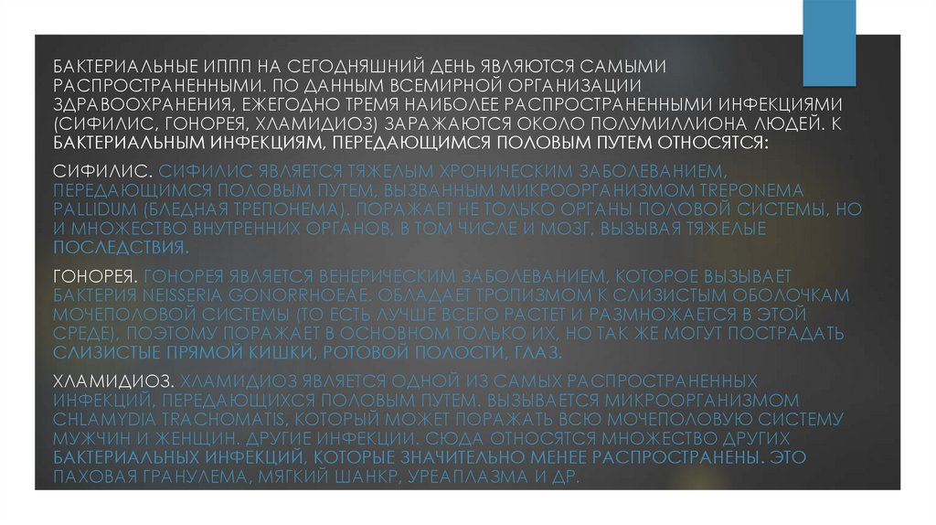 БАКТЕРИАЛЬНЫЕ ИППП НА СЕГОДНЯШНИЙ ДЕНЬ ЯВЛЯЮТСЯ САМЫМИРАСПРОСТРАНЕННЫМИ. ПО ДАННЫМ ВСЕМИРНОЙ ОРГАНИЗАЦИИ