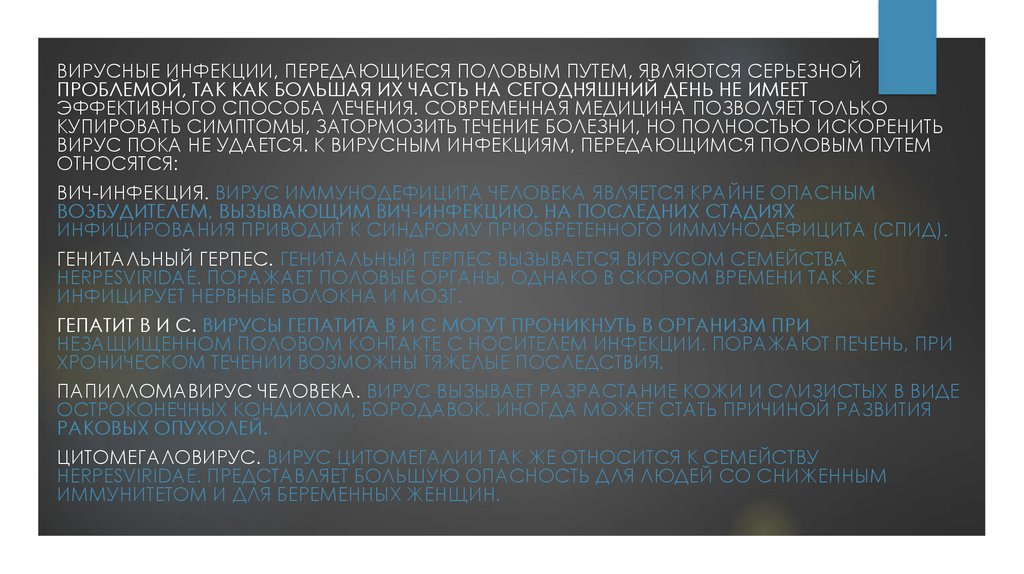 ВИРУСНЫЕ ИНФЕКЦИИ, ПЕРЕДАЮЩИЕСЯ ПОЛОВЫМ ПУТЕМ, ЯВЛЯЮТСЯ СЕРЬЕЗНОЙПРОБЛЕМОЙ, ТАК КАК БОЛЬШАЯ ИХ ЧАСТЬ НА СЕГОДНЯШНИЙ ДЕНЬ НЕ ИМЕЕТ