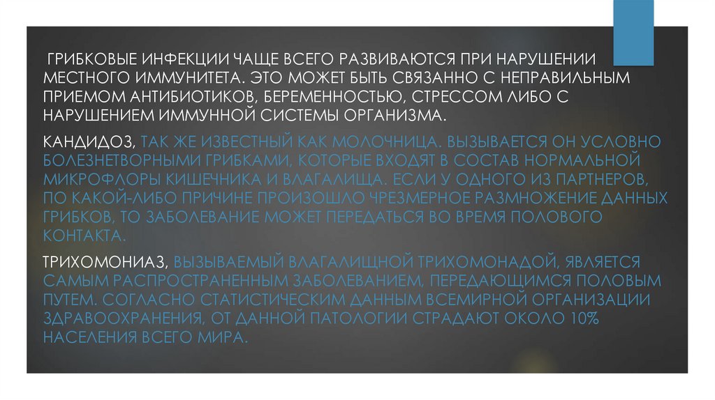 ГРИБКОВЫЕ ИНФЕКЦИИ ЧАЩЕ ВСЕГО РАЗВИВАЮТСЯ ПРИ НАРУШЕНИИМЕСТНОГО ИММУНИТЕТА. ЭТО МОЖЕТ БЫТЬ СВЯЗАННО С НЕПРАВИЛЬНЫМ