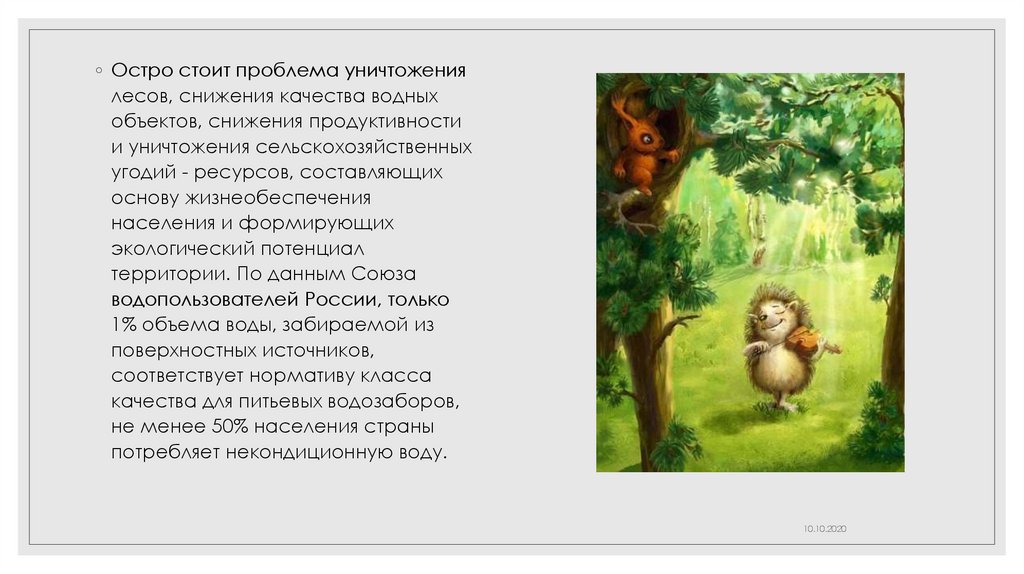 ◦ Остро стоит проблема уничтожениялесов, снижения качества водных