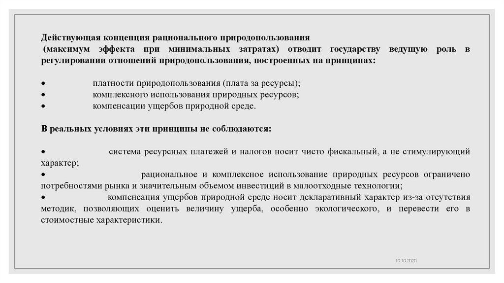 Действующая концепция рационального природопользования(максимум эффекта при минимальных затратах) отводит государству ведущую роль в