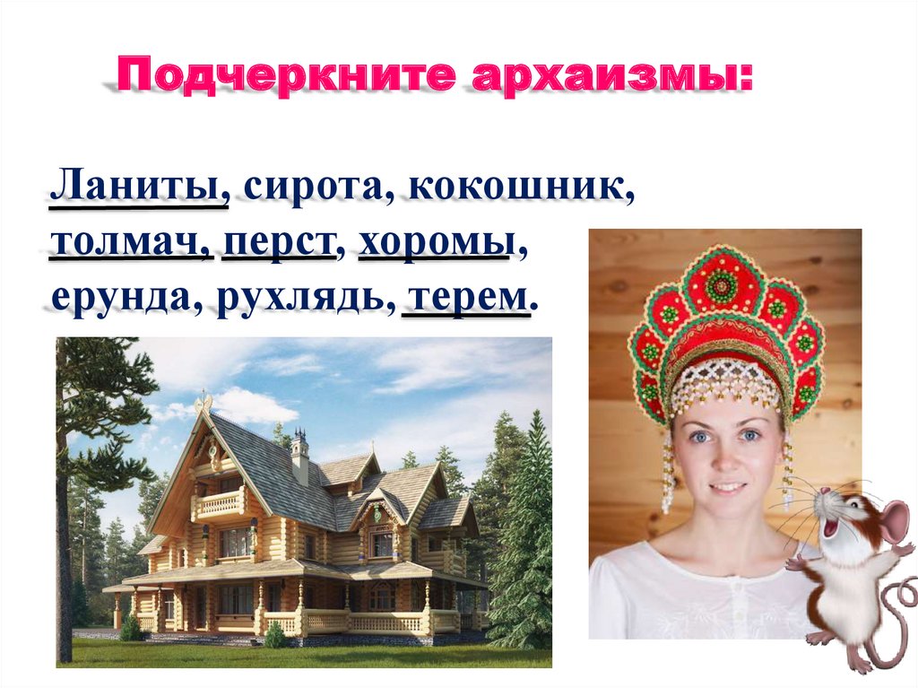 Подчеркните архаизмы:Ланиты, сирота, кокошник,