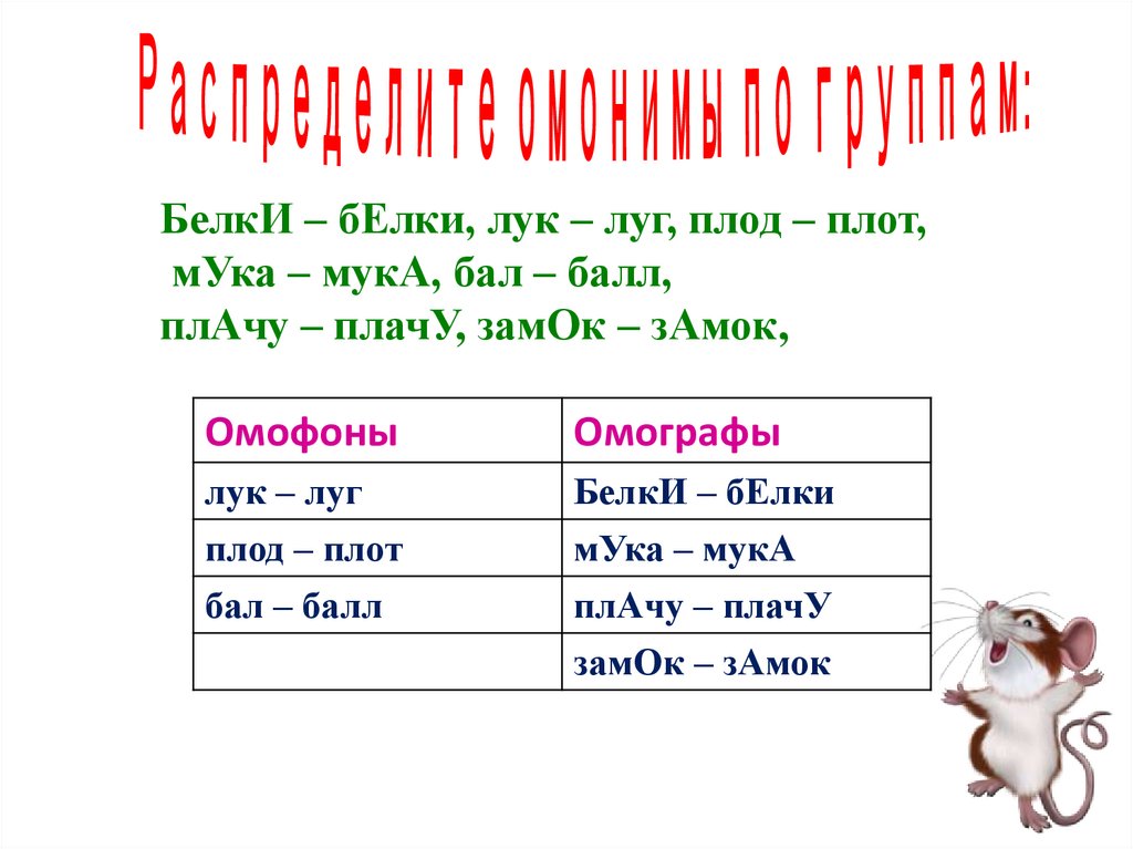БелкИ – бЕлки, лук – луг, плод – плот,мУка – мукА, бал – балл,