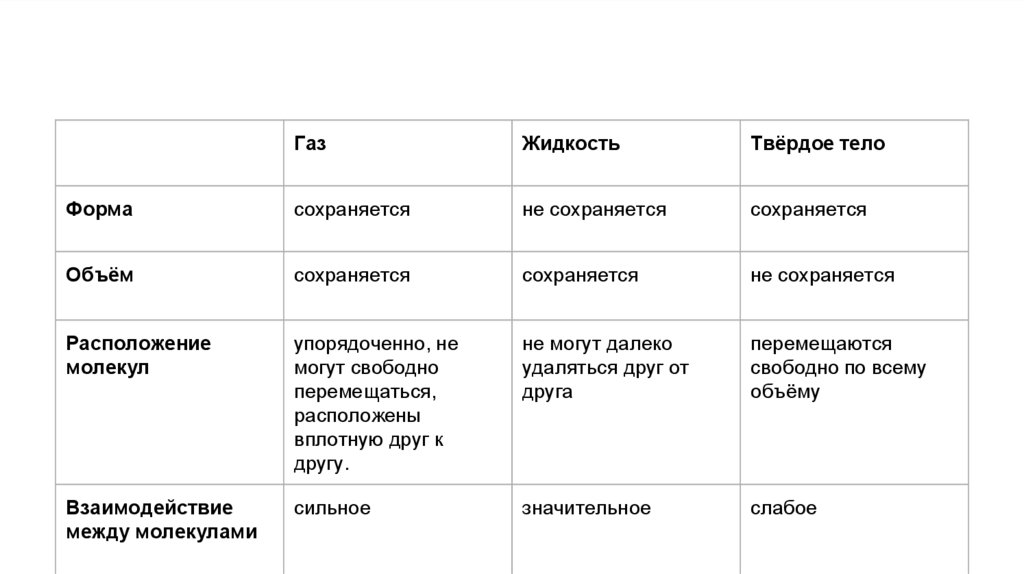 Выучить таблицу (особенности молекулярного строения вещества)