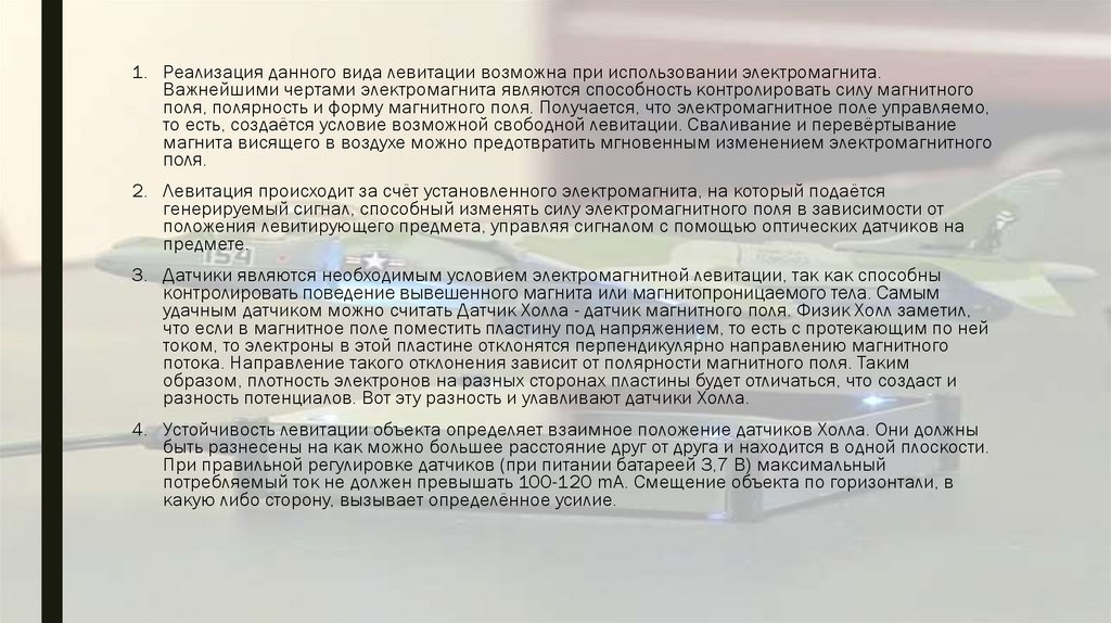 1. Реализация данного вида левитации возможна при использовании электромагнита.Важнейшими чертами электромагнита являются способность контролировать силу магнитного