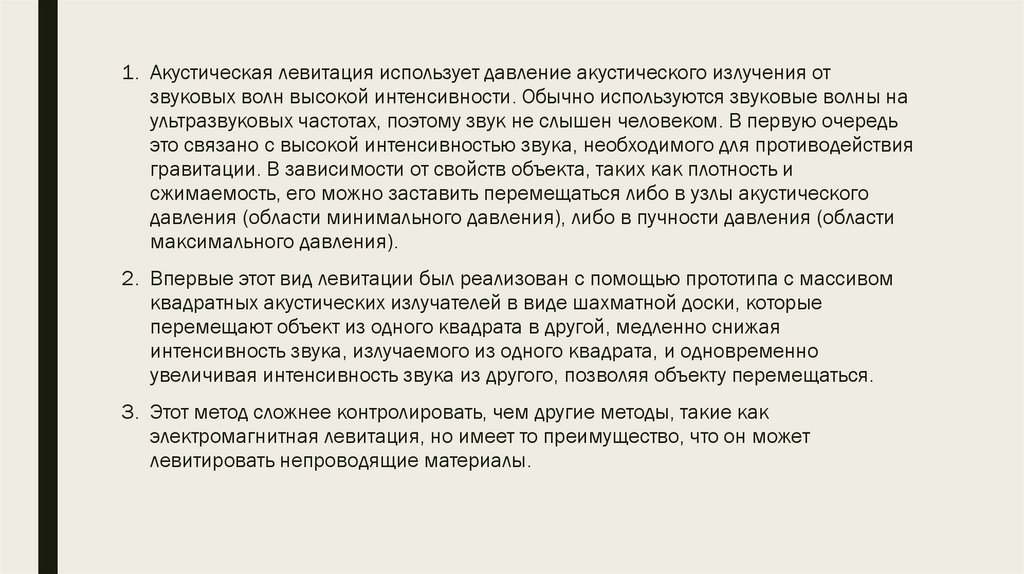 1. Акустическая левитация использует давление акустического излучения отзвуковых волн высокой интенсивности. Обычно используются звуковые волны на