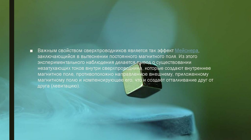 ■ Важным свойством сверхпроводников является так эффект Мейснера,заключающийся в вытеснении постоянного магнитного поля. Из этого