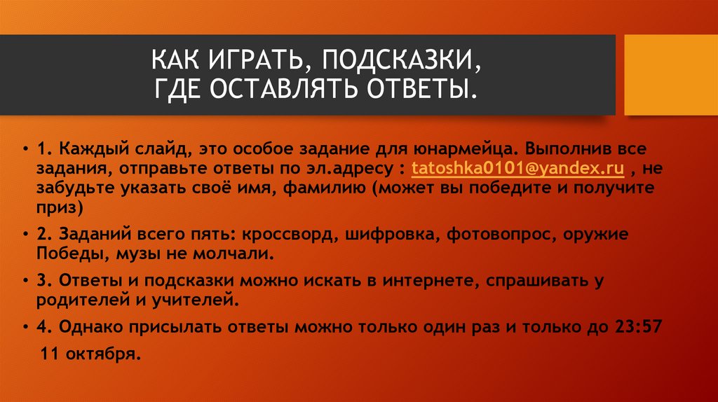 • 1. Каждый слайд, это особое задание для юнармейца. Выполнив все