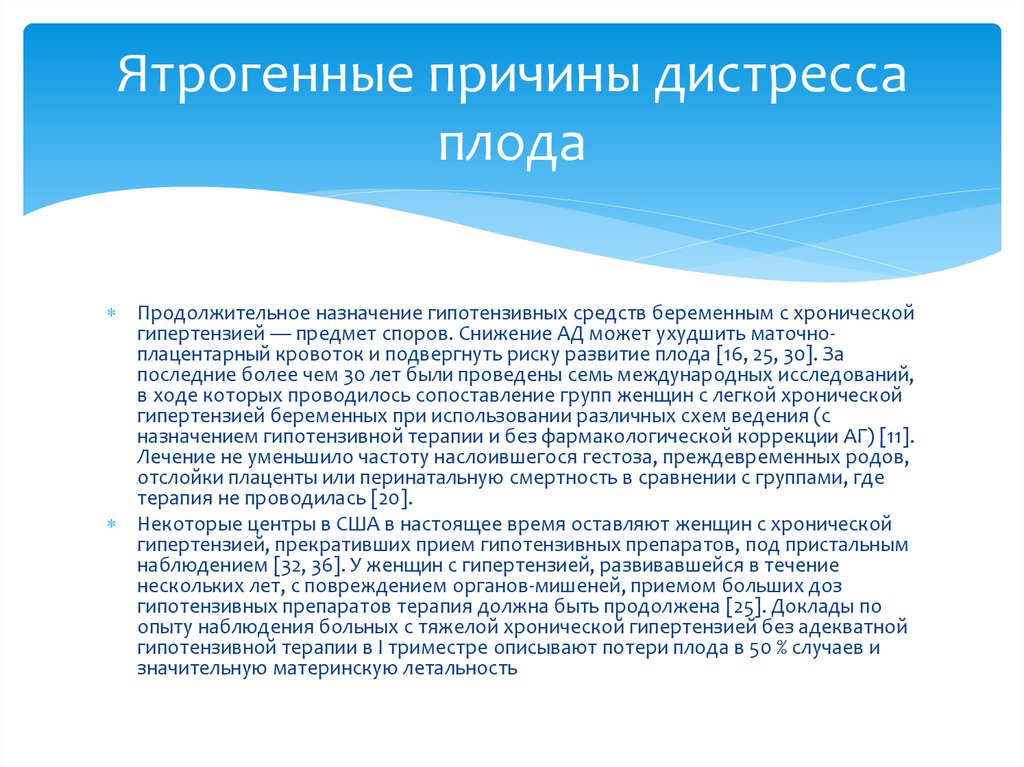 гипертензией — предмет споров. Снижение АД может ухудшить маточноплацентарный кровоток и подвергнуть риску развитие плода [16, 25, 30]. За