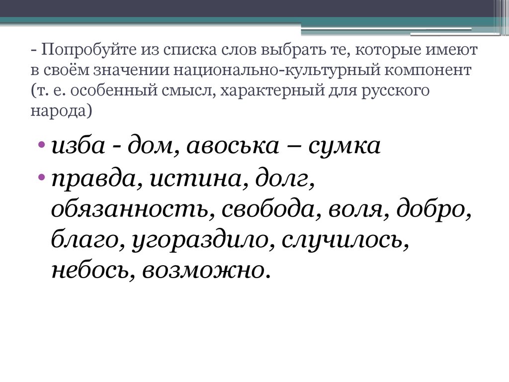 - Попробуйте из списка слов выбрать те, которые имеютв своём значении национально-культурный компонент