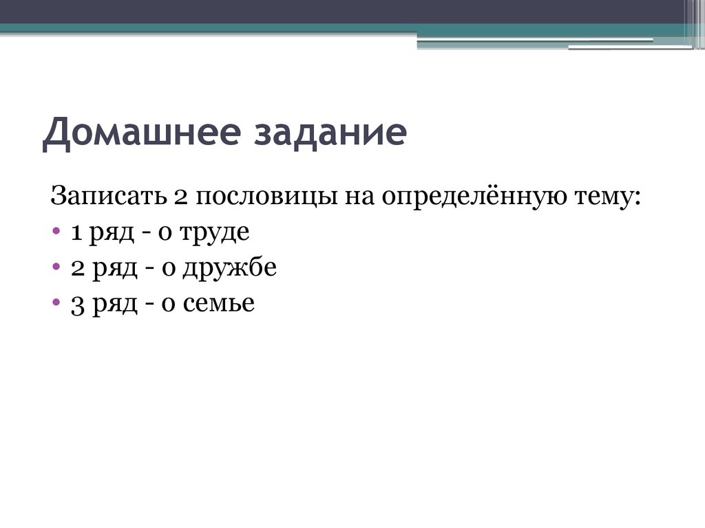 Домашнее заданиеЗаписать 2 пословицы на определённую тему: