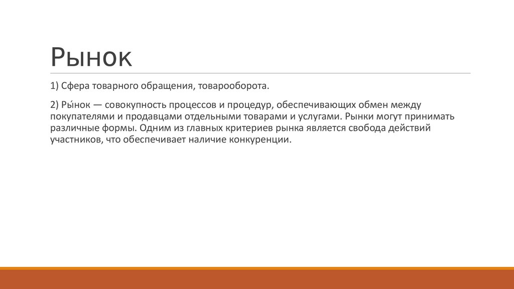 2) Ры́нок — совокупность процессов и процедур, обеспечивающих обмен между