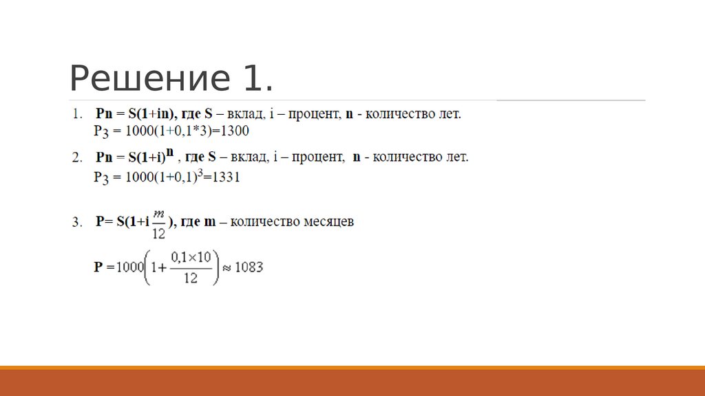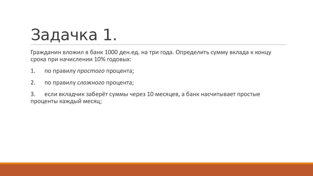 Задачка 1.Гражданин вложил в банк 1000 ден.ед. на три года. Определить сумму вклада к концу