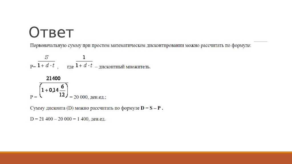 Задачка 2Через 6 месяцев с момента выдачи ссуды заемщик уплатил кредитору 21 400 ден.ед.