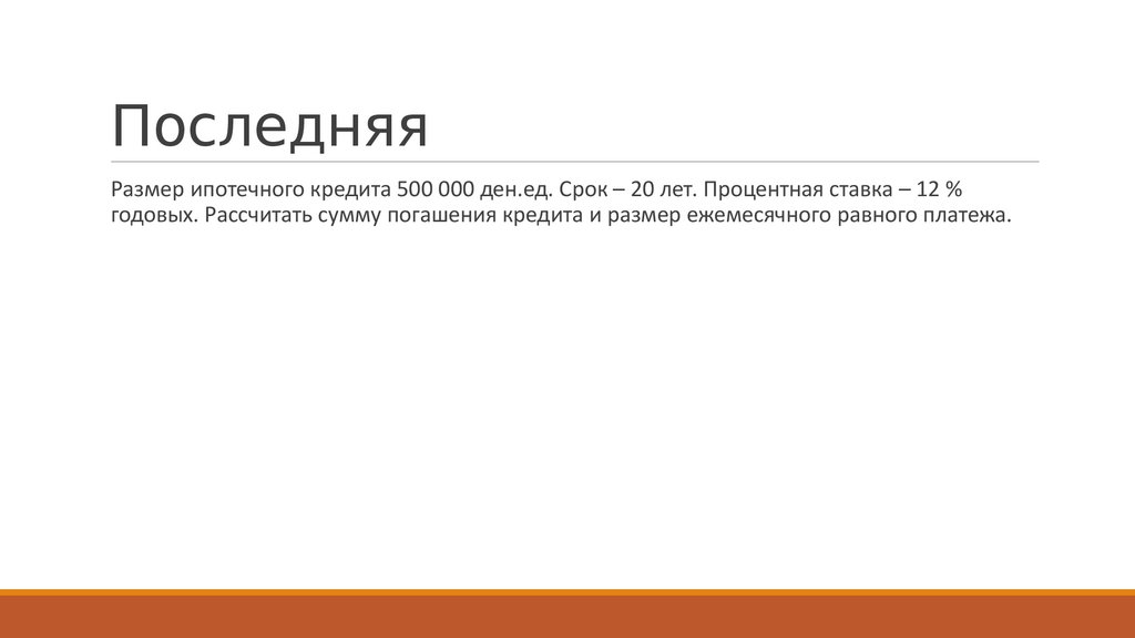 ПоследняяРазмер ипотечного кредита 500 000 ден.ед. Срок – 20 лет. Процентная ставка – 12 %