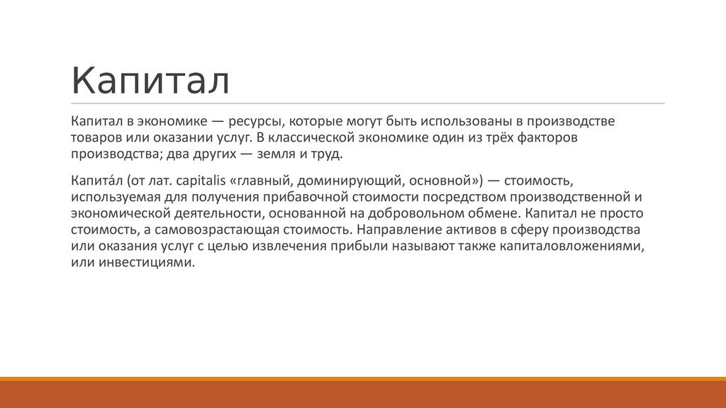 КапиталКапитал в экономике — ресурсы, которые могут быть использованы в производстве