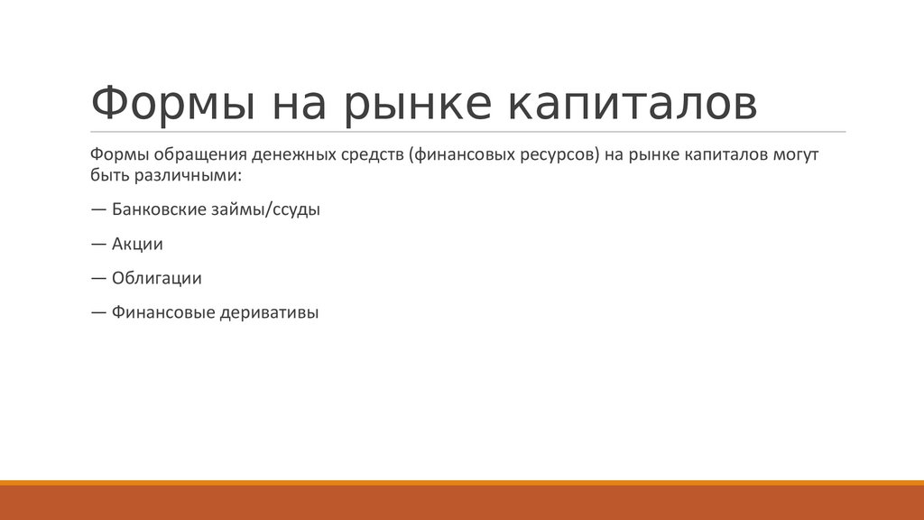 Формы на рынке капиталовФормы обращения денежных средств (финансовых ресурсов) на рынке капиталов могут