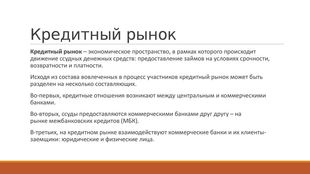 Кредитный рынокКредитный рынок – экономическое пространство, в рамках которого происходит