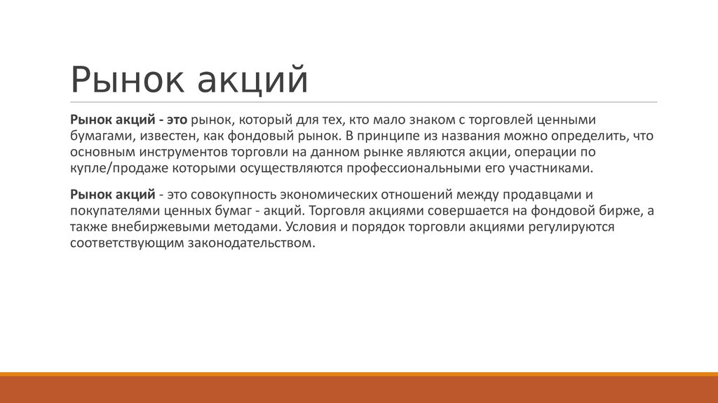 Рынок акцийРынок акций - это рынок, который для тех, кто мало знаком с торговлей ценными