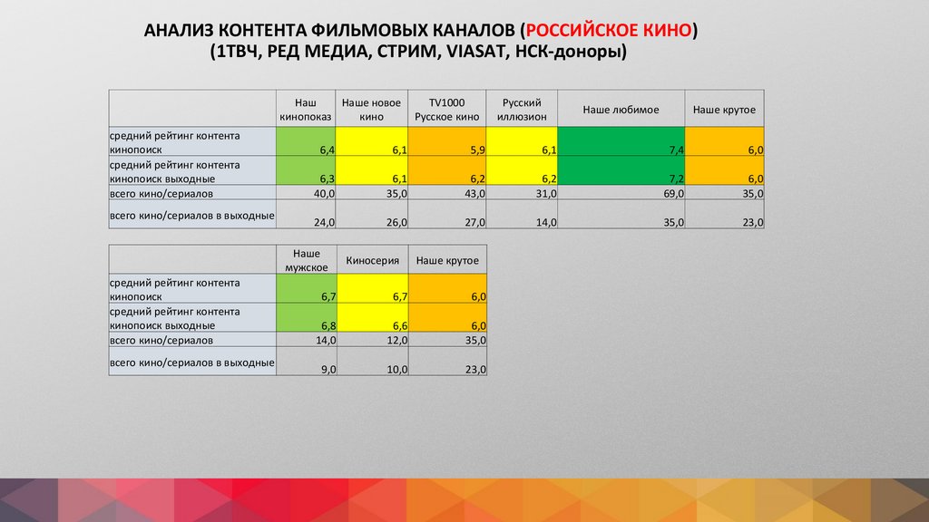АНАЛИЗ КОНТЕНТА ФИЛЬМОВЫХ КАНАЛОВ (РОССИЙСКОЕ КИНО)(1ТВЧ, РЕД МЕДИА, СТРИМ, VIASAT, НСК-доноры)