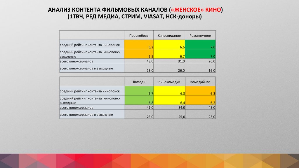АНАЛИЗ КОНТЕНТА ФИЛЬМОВЫХ КАНАЛОВ («ЖЕНСКОЕ» КИНО)(1ТВЧ, РЕД МЕДИА, СТРИМ, VIASAT, НСК-доноры)
