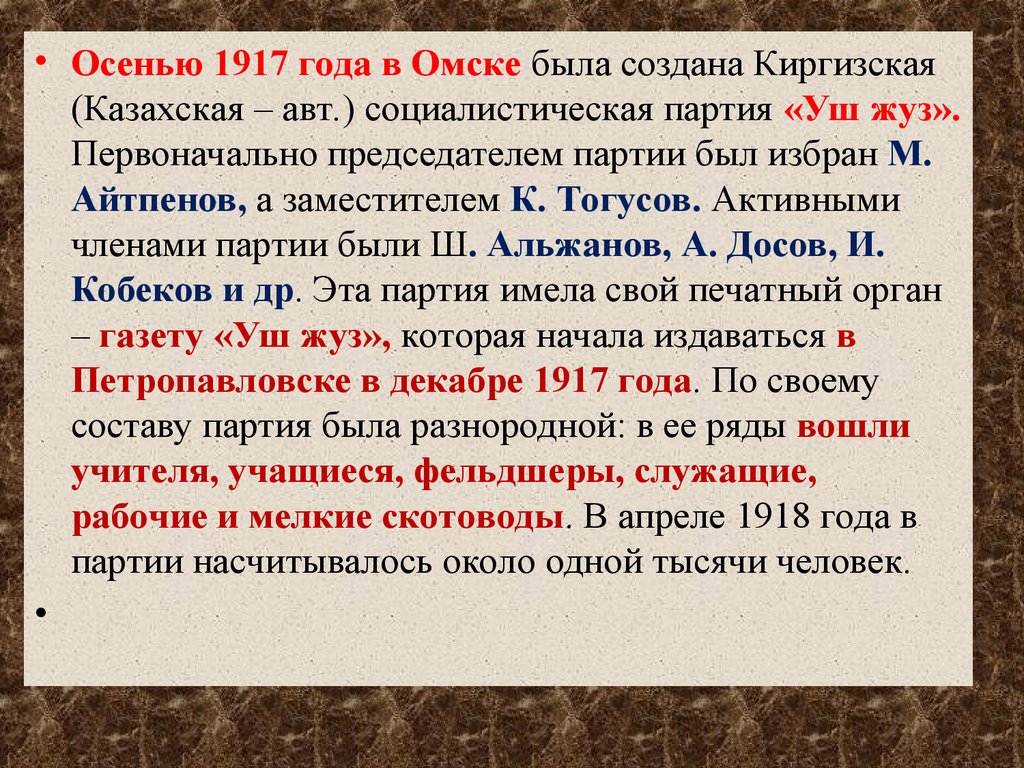 • Осенью 1917 года в Омске была создана Киргизская(Казахская – авт.) социалистическая партия «Уш жуз».