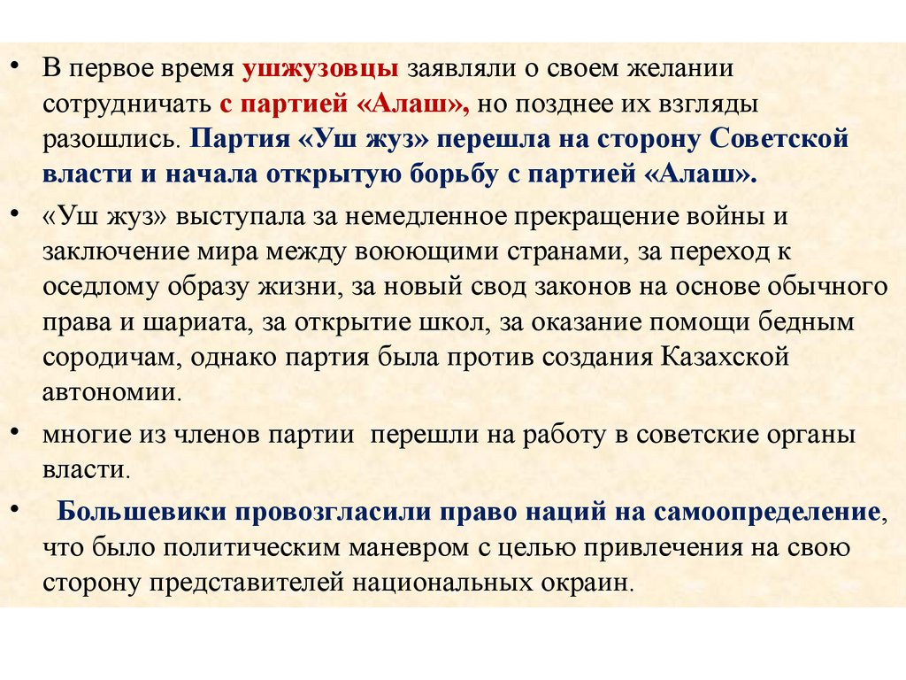 • В первое время ушжузовцы заявляли о своем желаниисотрудничать с партией «Алаш», но позднее их взгляды