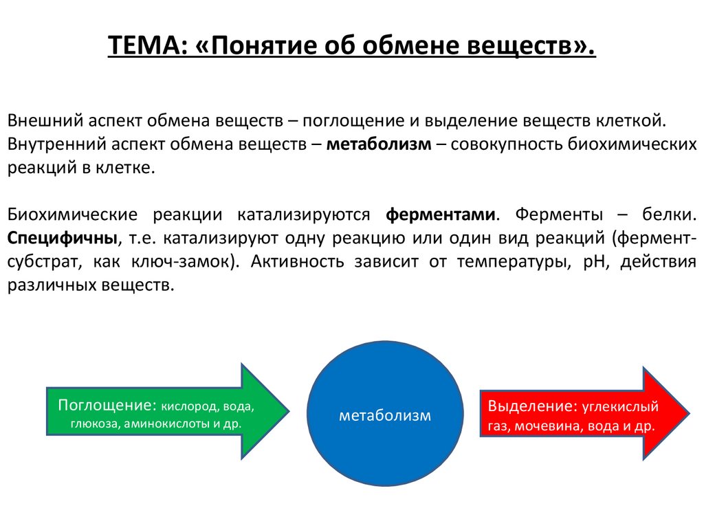 ТЕМА: «Понятие об обмене веществ».Внешний аспект обмена веществ – поглощение и выделение веществ клеткой.
