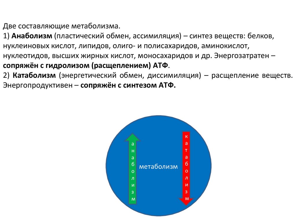 Две составляющие метаболизма.1) Анаболизм (пластический обмен, ассимиляция) – синтез веществ: белков,
