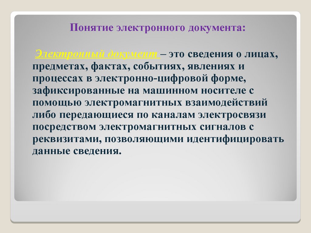 Понятие электронного документа:Электронный документ – это сведения о лицах,