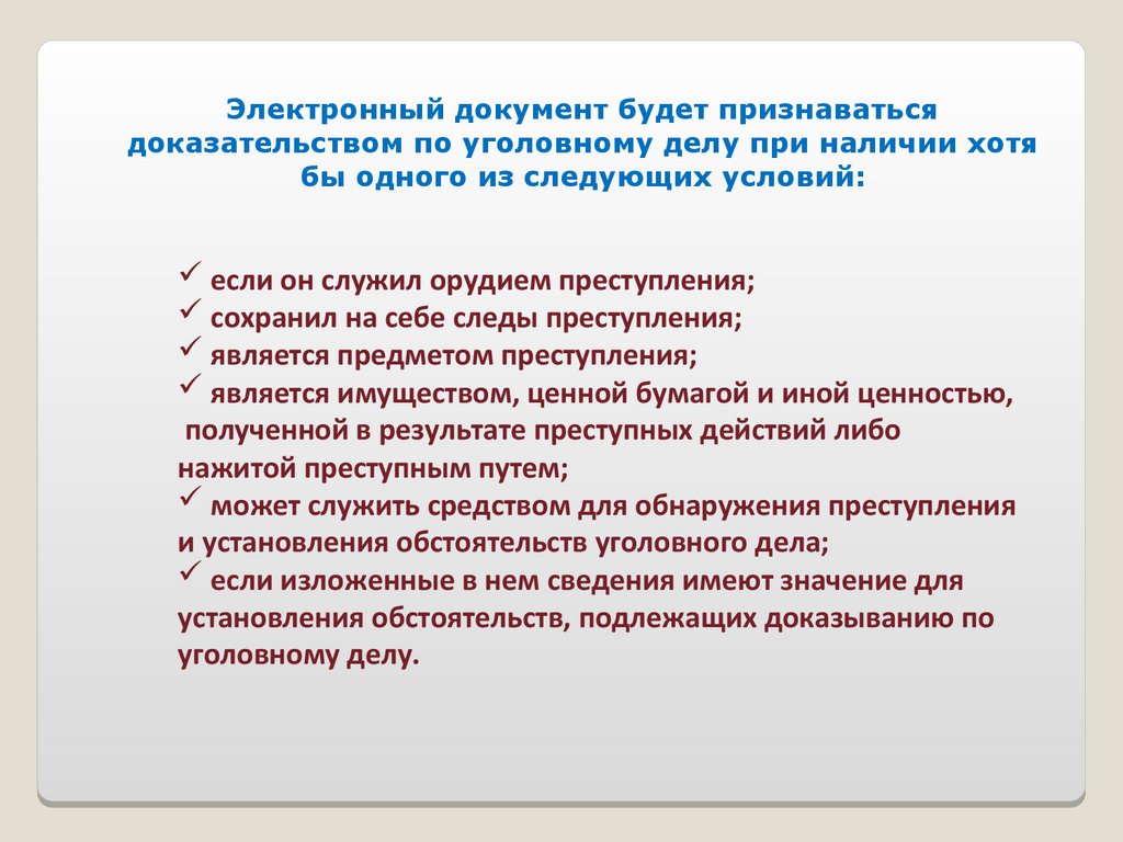 Электронный документ будет признаватьсядоказательством по уголовному делу при наличии хотя