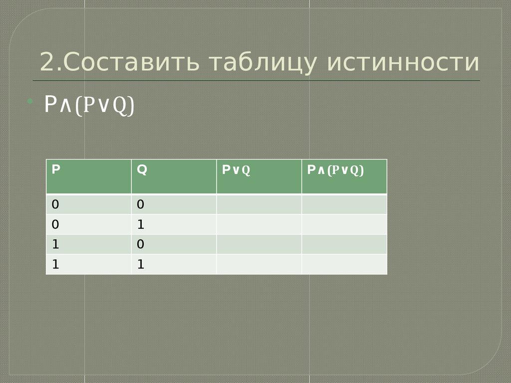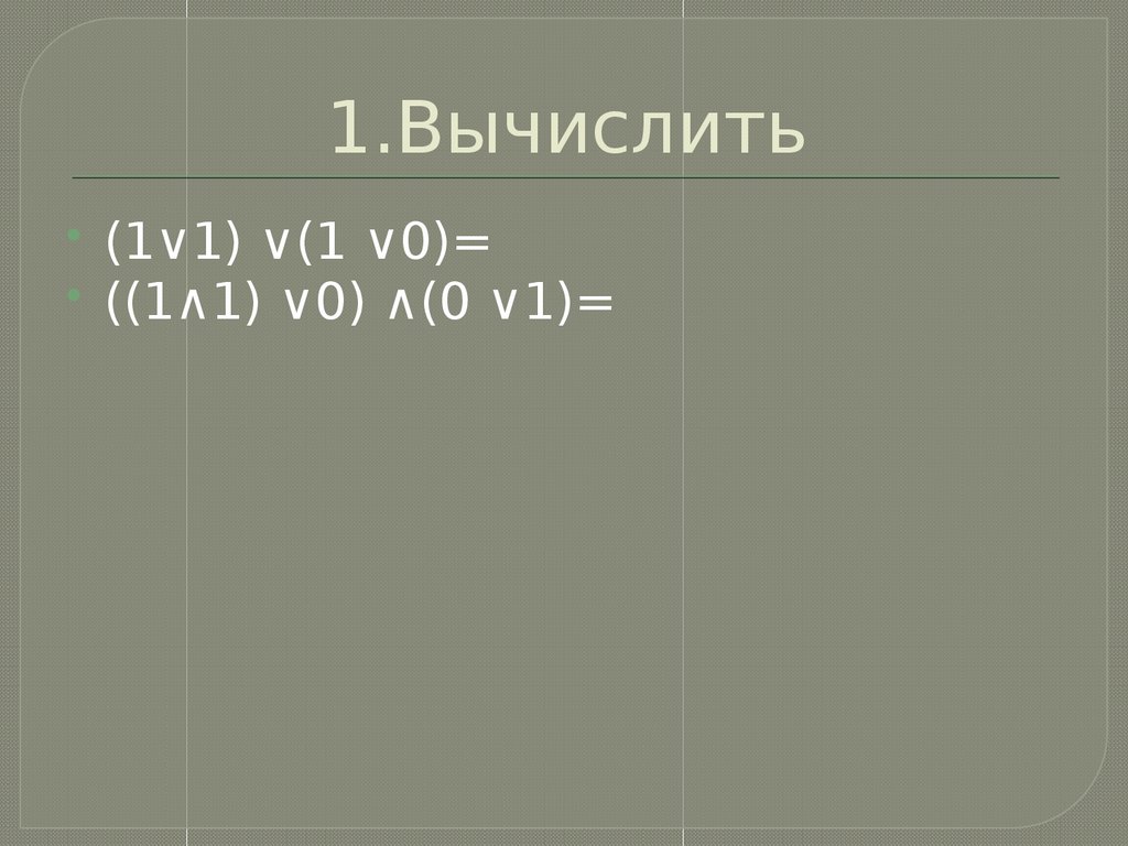 1.Вычислить(1∨1) ∨(1 ∨0)=
