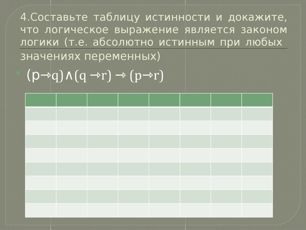 4.Составьте таблицу истинности и докажите,что логическое выражение является законом