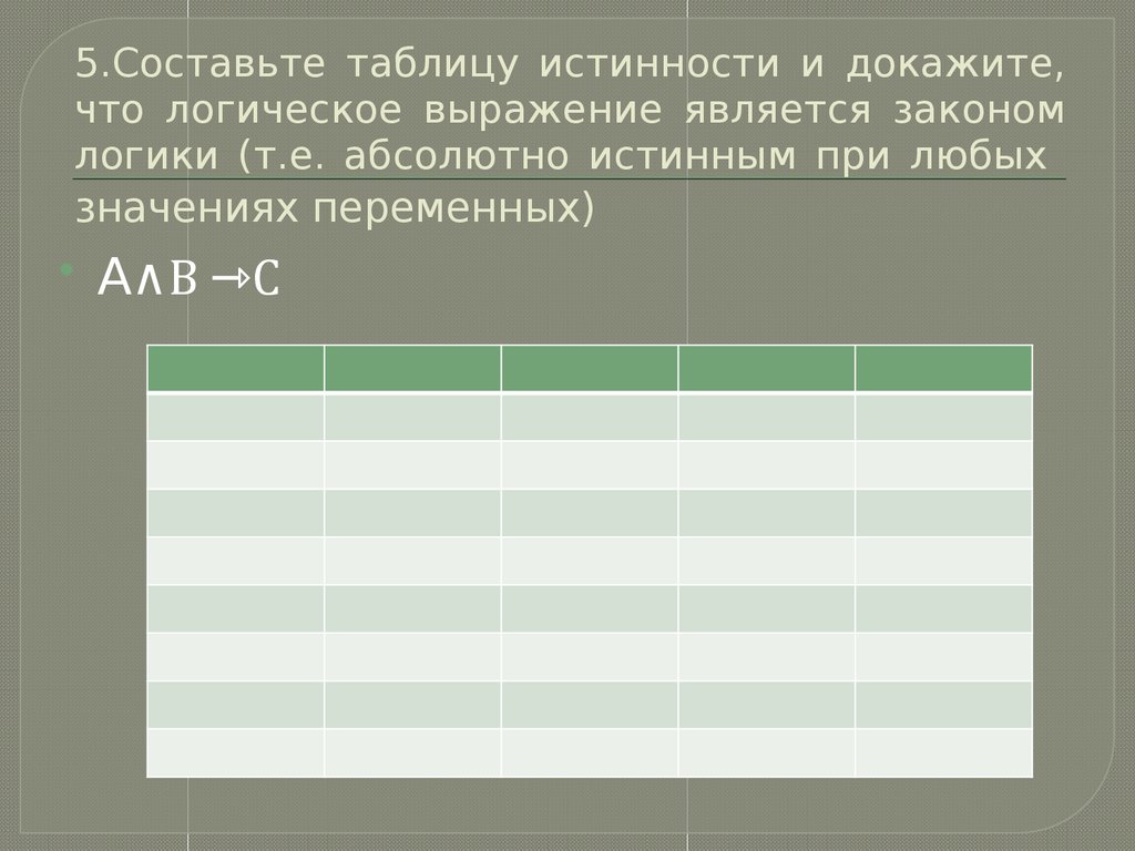 5.Составьте таблицу истинности и докажите,что логическое выражение является законом