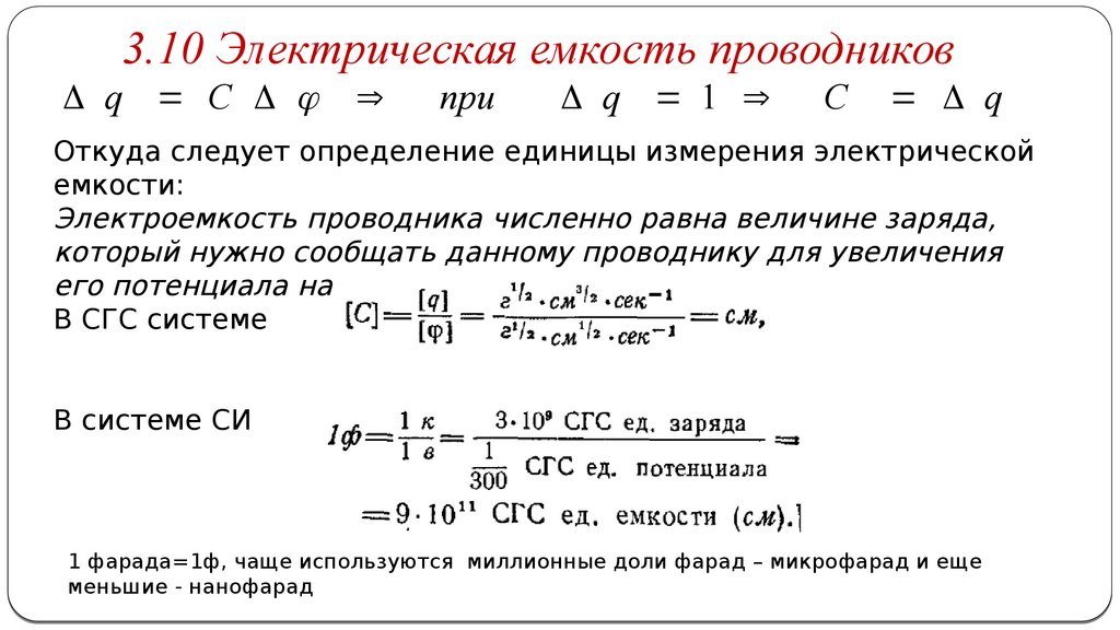 1 фарада=1ф, чаще используются миллионные доли фарад – микрофарад и еще
