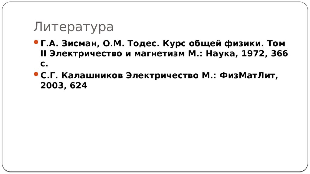 ЛитератураГ.А. Зисман, О.М. Тодес. Курс общей физики. Том