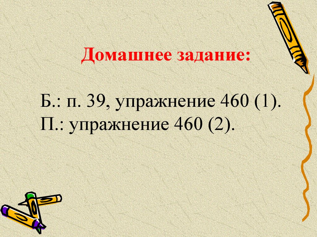 Домашнее задание:Б.: п. 39, упражнение 460 (1).
