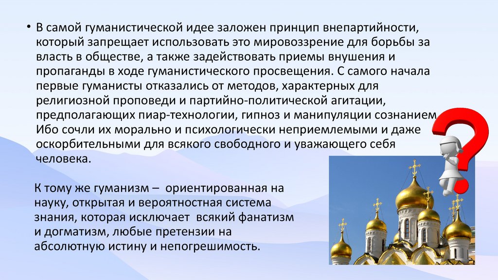 • В самой гуманистической идее заложен принцип внепартийности,который запрещает использовать это мировоззрение для борьбы за